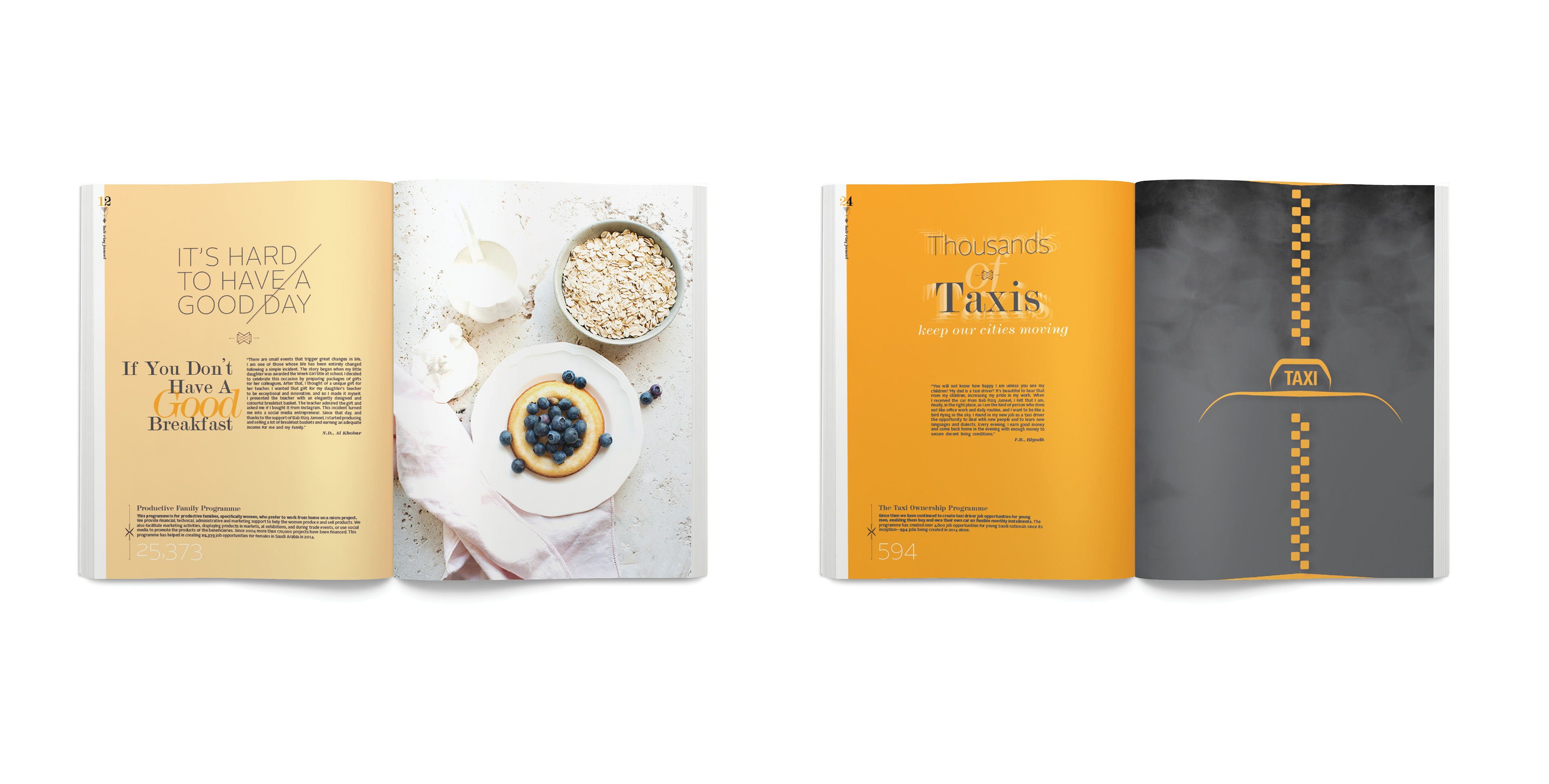 The ALJ Community Initiatives Annual Report 2014 was crafted from scratch in both English and Arabic; using Arabic calligraphy and lettering with a mix of modern layouts and illustrations. The result was a visually inviting book that does justice to its content.